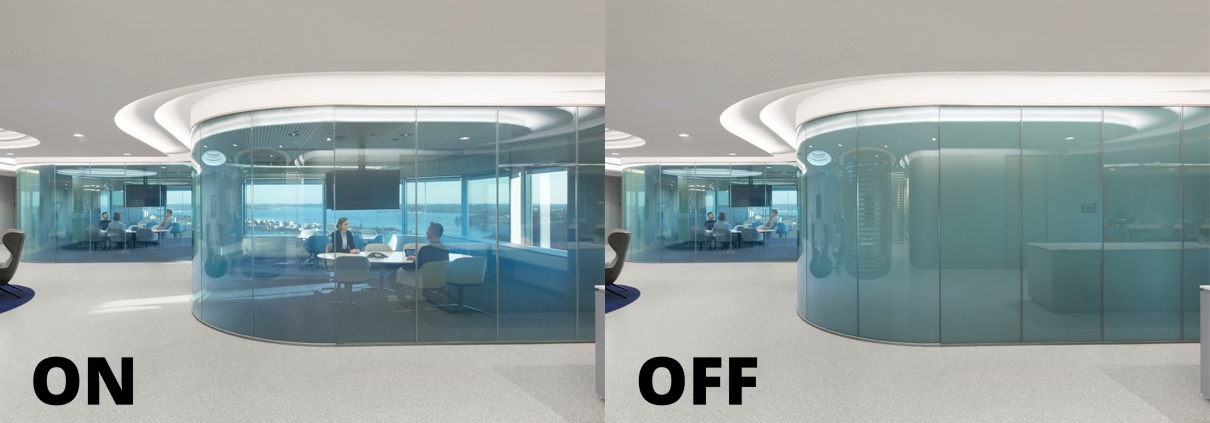 در ساختمان‌های اداری شیشه هوشمند مات شونده می‌ تواند به ایجاد اتاق‌ های جلسات خصوصی و فضاهای کاری باز کمک کند. با استفاده از این شیشه‌ ها فضاها می‌ توانند به راحتی تغییر شکل دهند و بدون نیاز به نصب دیوارهای فیزیکی بخش‌ های مختلف محیط از یک دیگر جدا شوند.